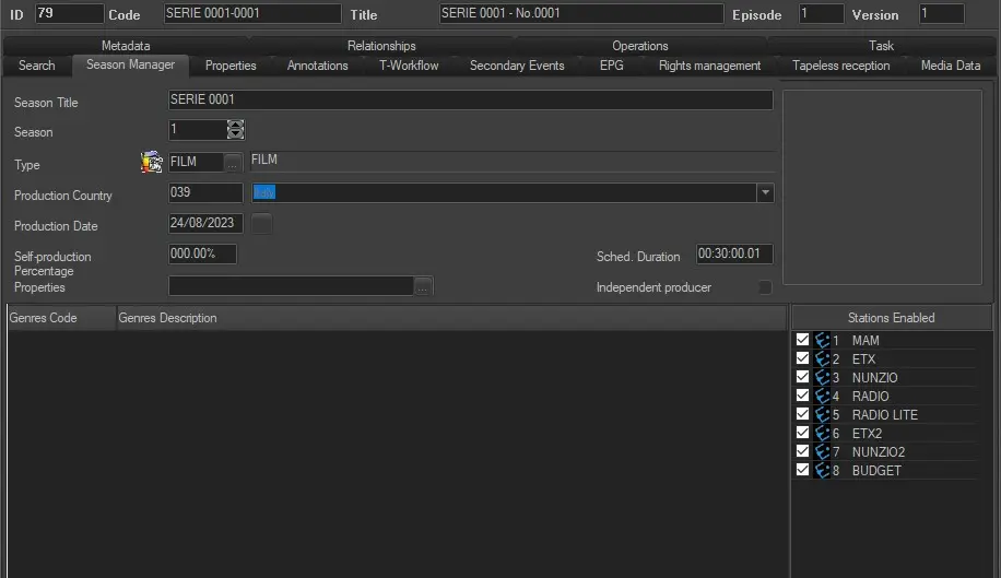 The Season manager tab (called General for standard assets, see the previous chapter) allows to view and modify the same data as the General tab, including the following additional properties: