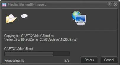 Each selected file will be physically copied to the chosen destination and linked (with the specified cloud-device and codec) to a new asset form for which a default media file import T-workflow will be launched.