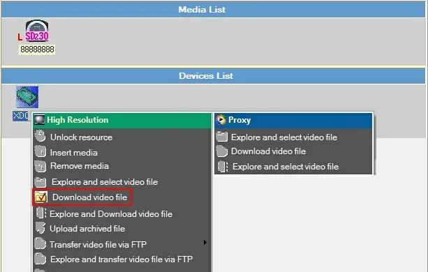 NB: Please note that during the download, the system needs locking the XDCAM resource, therefore, in case the device is locked by another module/system, an error message will be displayed.