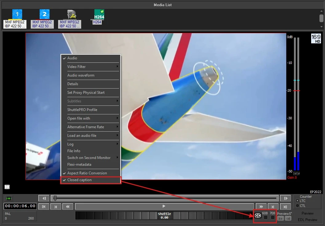 7. Like its predecessor, Etere Player 2022 can display closed captions along with the video file. In order to enable them, right click on the player and select "Closed Captions" option. "608" and "708" checkboxes will appear in the bottom-right corner, below the player controls. Activate the one corresponding to the type of cc to display. To disable the CC visualization, uncheck the box or disable the player option.