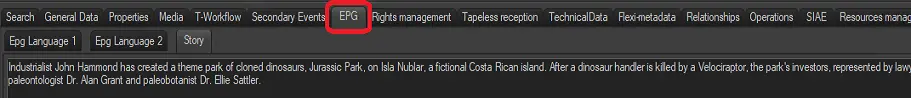 The EPG tab is used to insert additional data regarding asset's EPG (up to 2 different languages) and the plot of the Storyline, this by compiling the three relative text-wrapped boxes which are available on the main window: