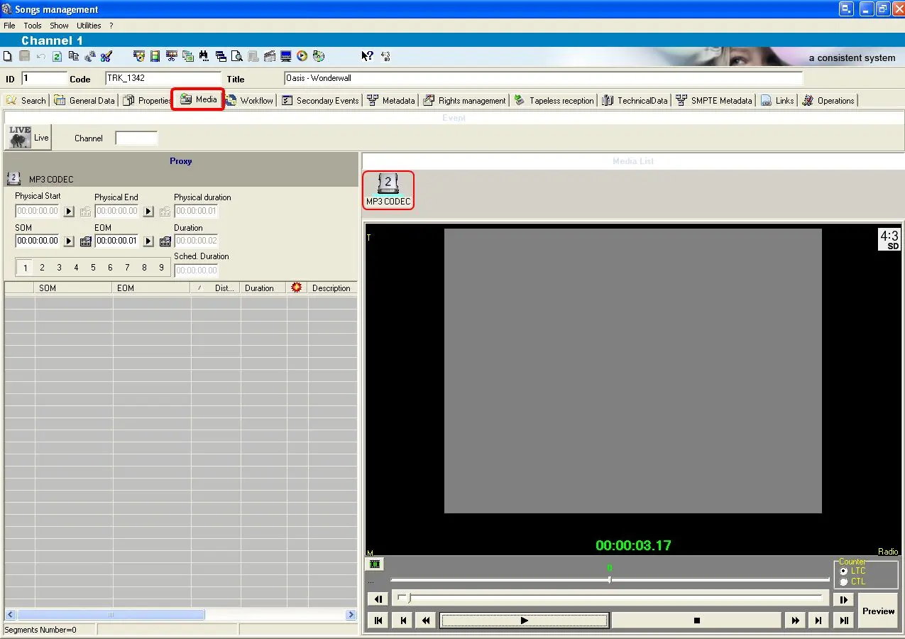 The media tab holds information regarding the media content associated to the asset form, allowing to view and modify their timecode details as well as previewing the related files: