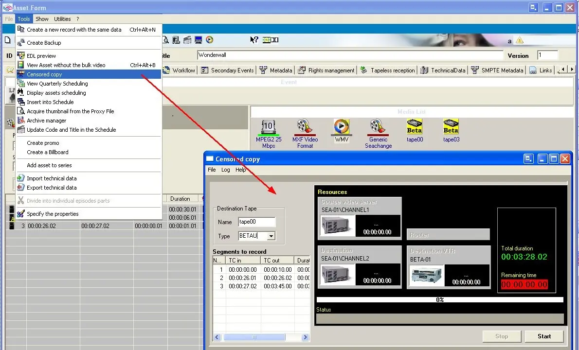 Once launched, it will be required to select the tape on which the censored copy will be stored, then, it will be possible to start the operation.T he copy will be made on a video server and on a tape: