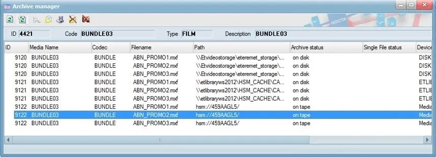 Description: The archived file is copied on disk using Etere HSM into the data tape (long-term archive). An XML file will also be archived in the same data tape; it will contain its primary information (i.e., ID, code and description) as well as all asset data stored in the Etere database tables (e.g., FSerie, FInterruzioni, etc.).