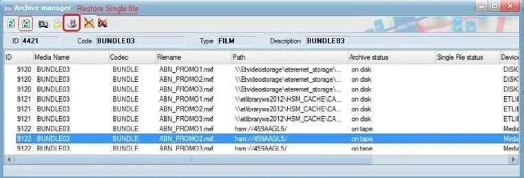 Description: Restores the file from the data tape (long-term archive) to the disk (short-term archive),