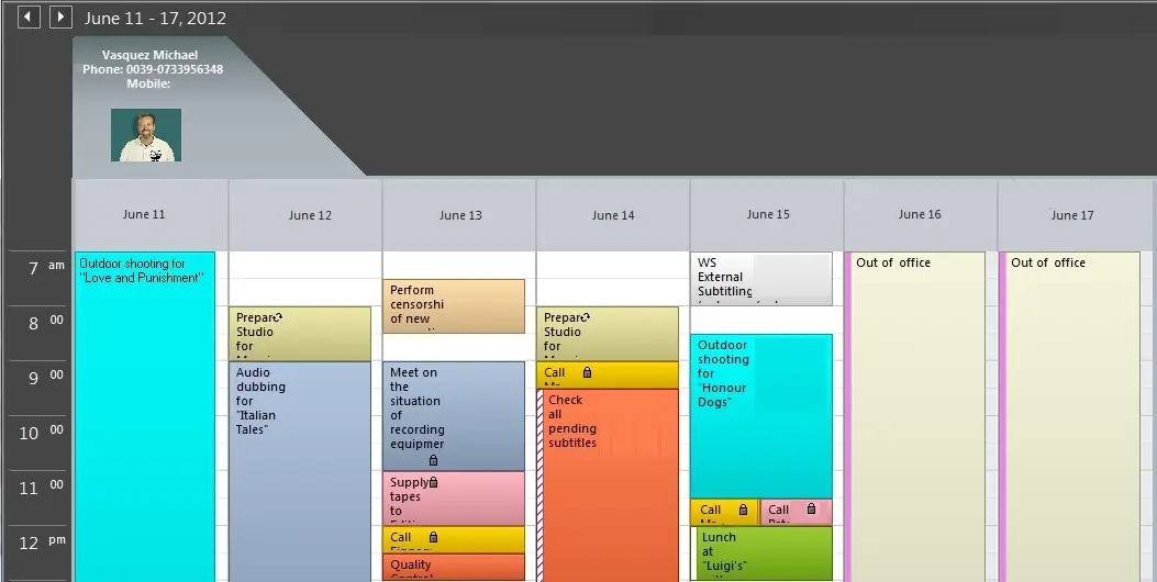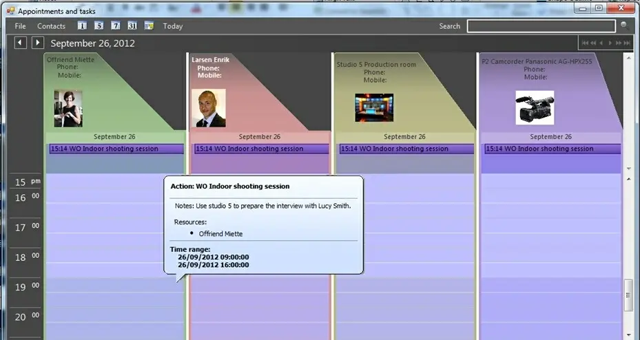Resources assigned to complete a certain operation (e.g. a shooting session) can be viewed in the calendar along with their related appointment just by opening them from the Contacts menu: