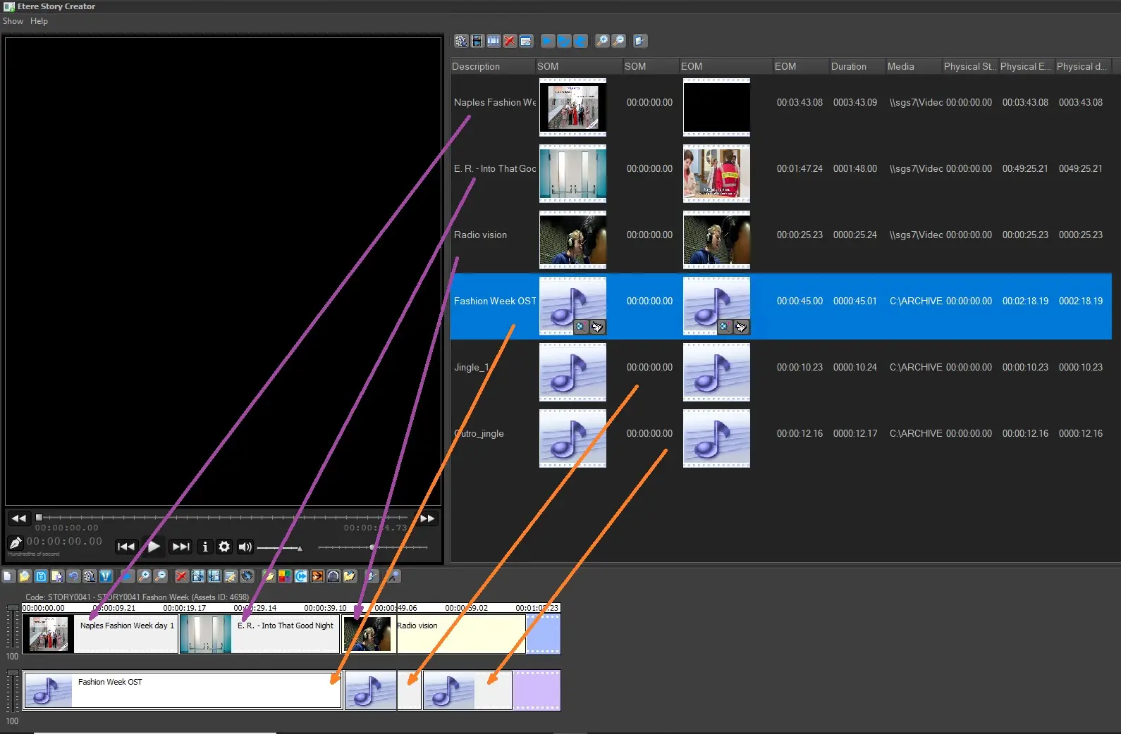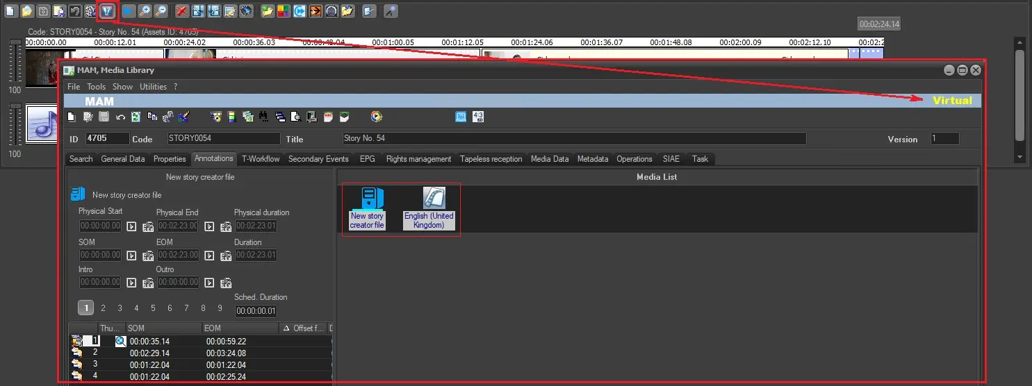 2. Press the [ Virtual asset] button from the toolbar, it will be created a new "virtual asset" containing the story (.etl) with the references to the needed asset's media segments: