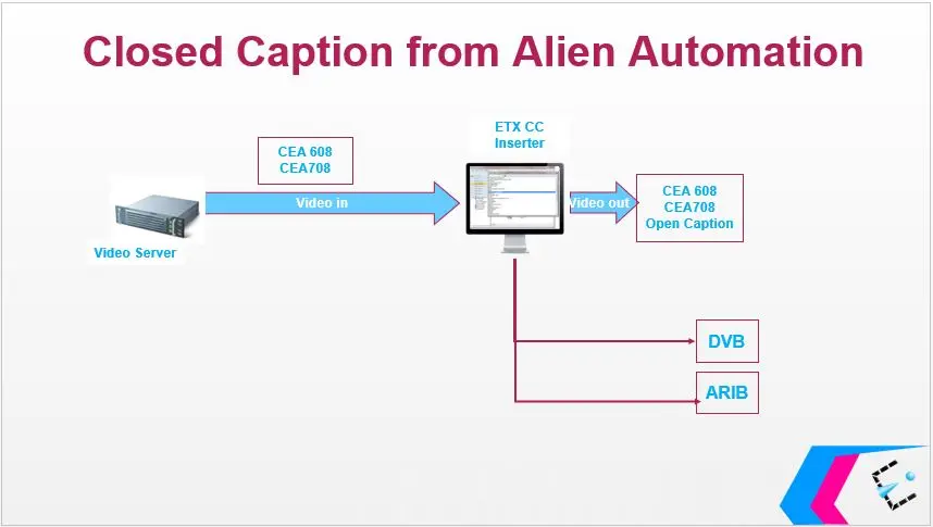 ETX Inserter adopt CEA-608 and CEA-708 captions standard when inserting closed captions, it insert SDI captions and produce a digital stream to insert digital closed captions using ARIB (Association of Radio Industries and Business) and DVB (Digital Video Broadcasting) set of standards.