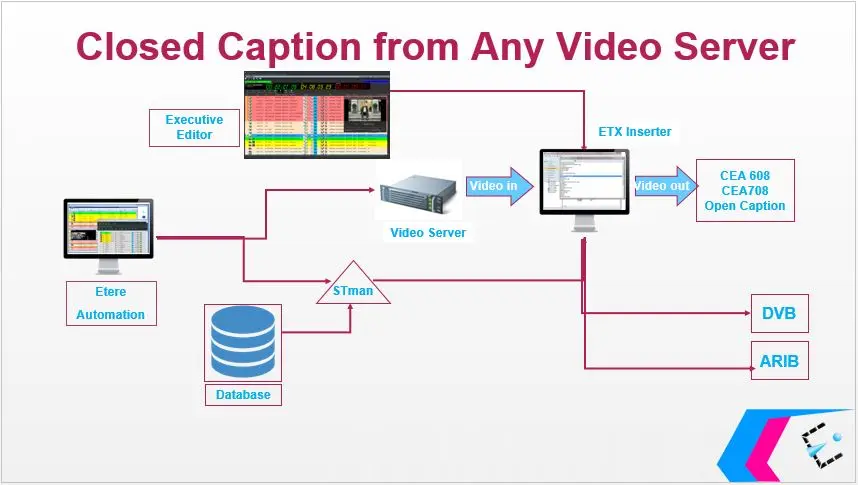 ETX Closed Captions Inserter can be used to insert closed captions into recorded media and Live playout. When using ETX Inserter it does not require playout from ETX Server, you can insert the closed captions in any legacy server or mixes of traditional master control switcher with ETX solutions.