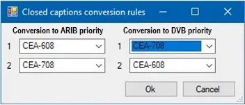 Next, define the priority when converting to ARIB or DVB closed captions with CEA-608 or CEA-708 standards, where the “first” defined closed captions standard would be used in respective conversion process. It is not mandatory to set the conversion rule for both ARIB and DVB closed captions, for example, you can define the setting in “Conversion to ARIB priority” and leave the “Conversion to DVB priority” setting untouched (settings remains as “None”).