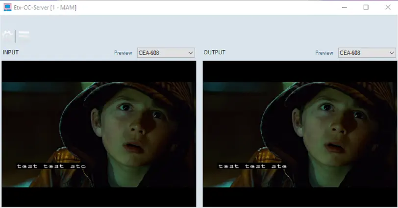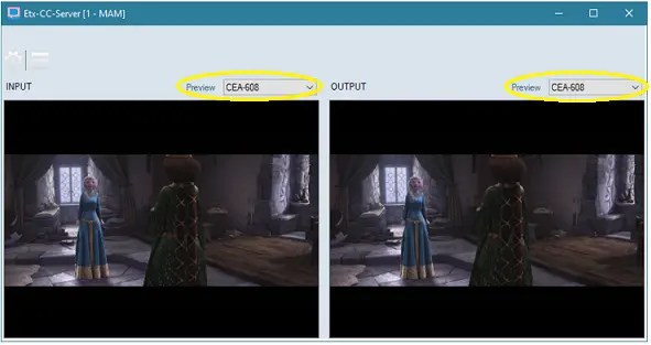 When the ETX Closed Captions Server is launched, you can select the closed captions standards CEA-608 or CEA-708 to be monitored in the Input and Output Preview window, respectively, by click on the closed captions standard from the selection textbox.