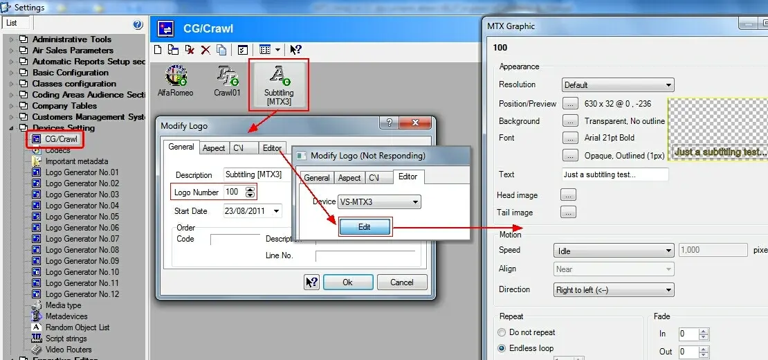 In case of using a ETX to automatically display subtitles for broadcasting events it will be necessary to configure the Crawl and Script to be used for sending subtitles to the ETX Logo, the configuration procedure is described below: