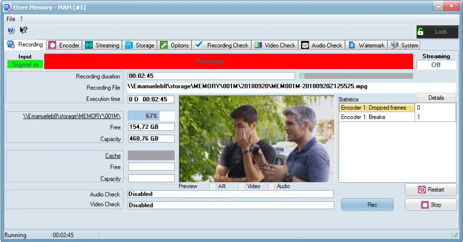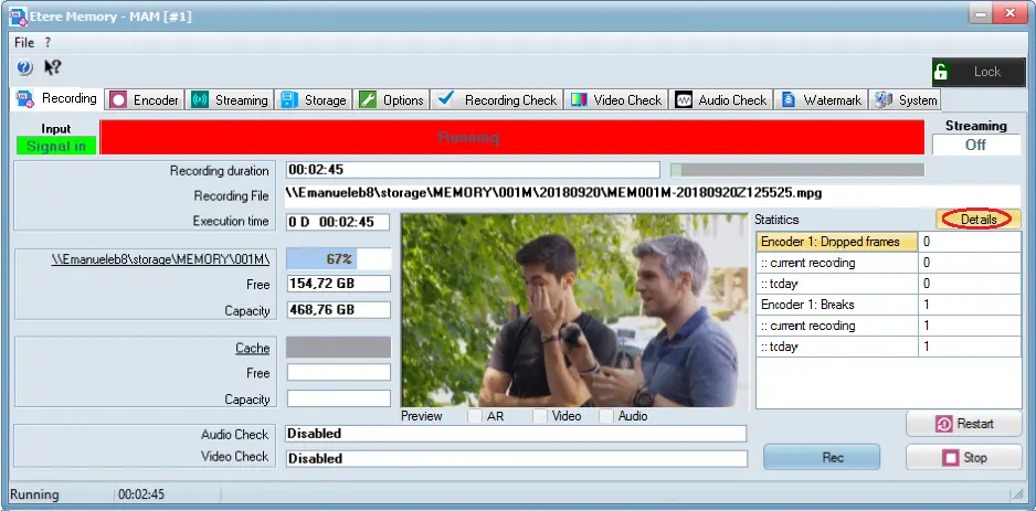 In this instance, only one Encoder profile “Encoder 1” in created in Memory. The statistics are captured and compressed in summary, you would need to click on the <Details> button to view the detail statistics captured during recording in Encoder 1.