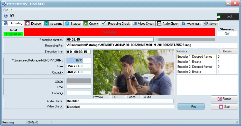 When recording is in progress, the “Statistics” window at the right panel would be activated and start collecting the dropped frames and recording breaks occurred during recording in each Encoder, depending on the number of Encoder profiles you had configured.