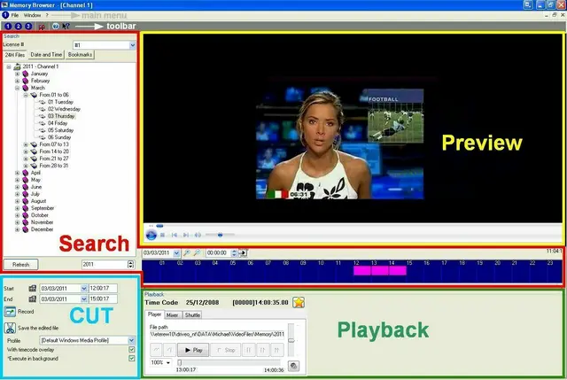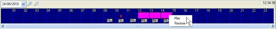 As shown in the image above, by right-click on certain time slot, it is possible to play (the recorded video will be loaded in the preview area) or restore (a red up arrow will indicate that the restore is in progress) the memory files.