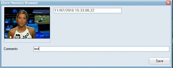 When the Memory Browser is launched, enter the text comment in the parameter field to the video file currently in play. In this instance, enter <test> as comments. Click the <Save> button to save the comments as <test>.