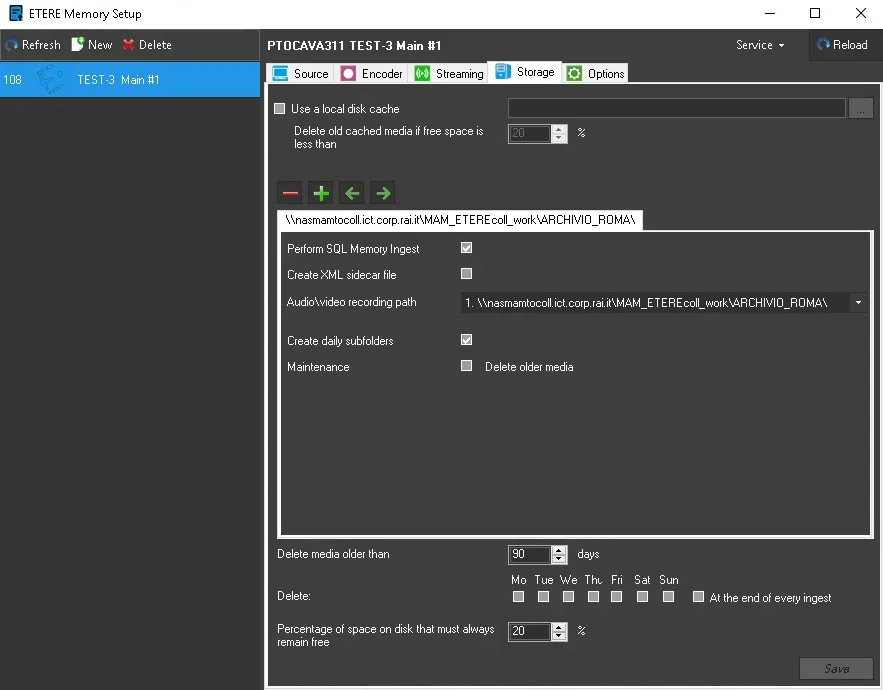 Maintenance: if enabled enbles the deletion of the older files into the final recording path according to the delete settings below.