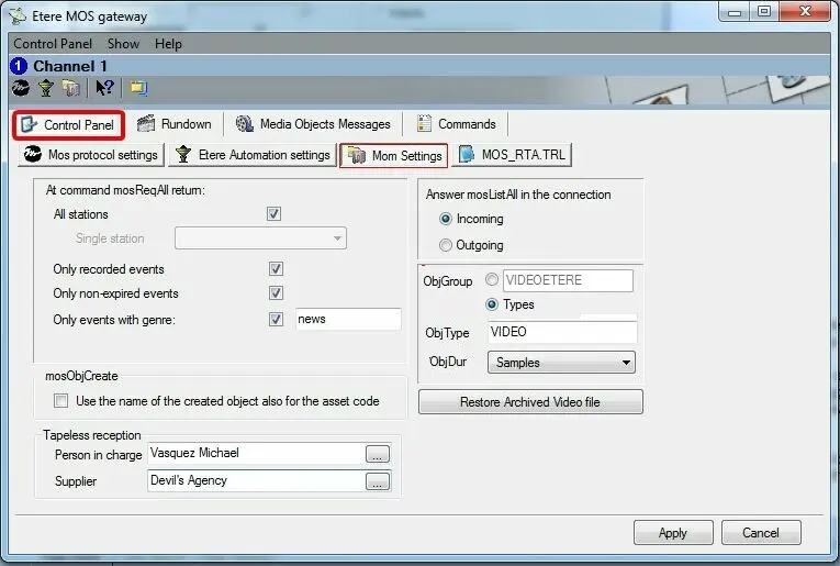 •Mom (Media Object Messages): by activating this option it is possible to acquire assets from a videoserver and to send them to the Newsroom system (e.g.: ENPS) server. Once sent, assets are considered like Newsroom system's objects, therefore used for Running Orders creation. If this function is deactivated, Etere MOS Gateway will not send an asset (object) to the ncsID. To define on which folder to create the new Video Object on the Newsroom system (e.g.: ENPS), edit the Etmon.ini on \program files\etere\ which by default is ObjGroup=ETERE