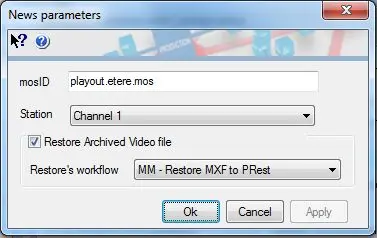 Launch Etere NCRS OCX (EtEnps.exe) and set under the "NEWS Parameters" section the identification of the Media Object Server, the station to which the news broadcast is related and the workflow to be used for restoring video files.