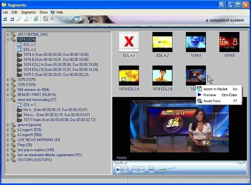 If you select the asset on the top right window, the EDL and all the Picons for the available segment will be displayed. If the video is not available it will display a Red Cross. Right Click on the Picons to insert the segment on the Entire EDL in the Rundown, preview the low-res Files or open the asset form.