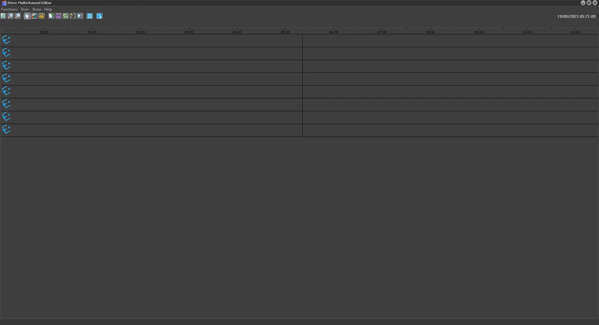 Once you have opened it, the software automatically reads the published schedules and shows the whole daily schedule along the timeline. Below is illustrated how the main Multichannel Editor window looks: