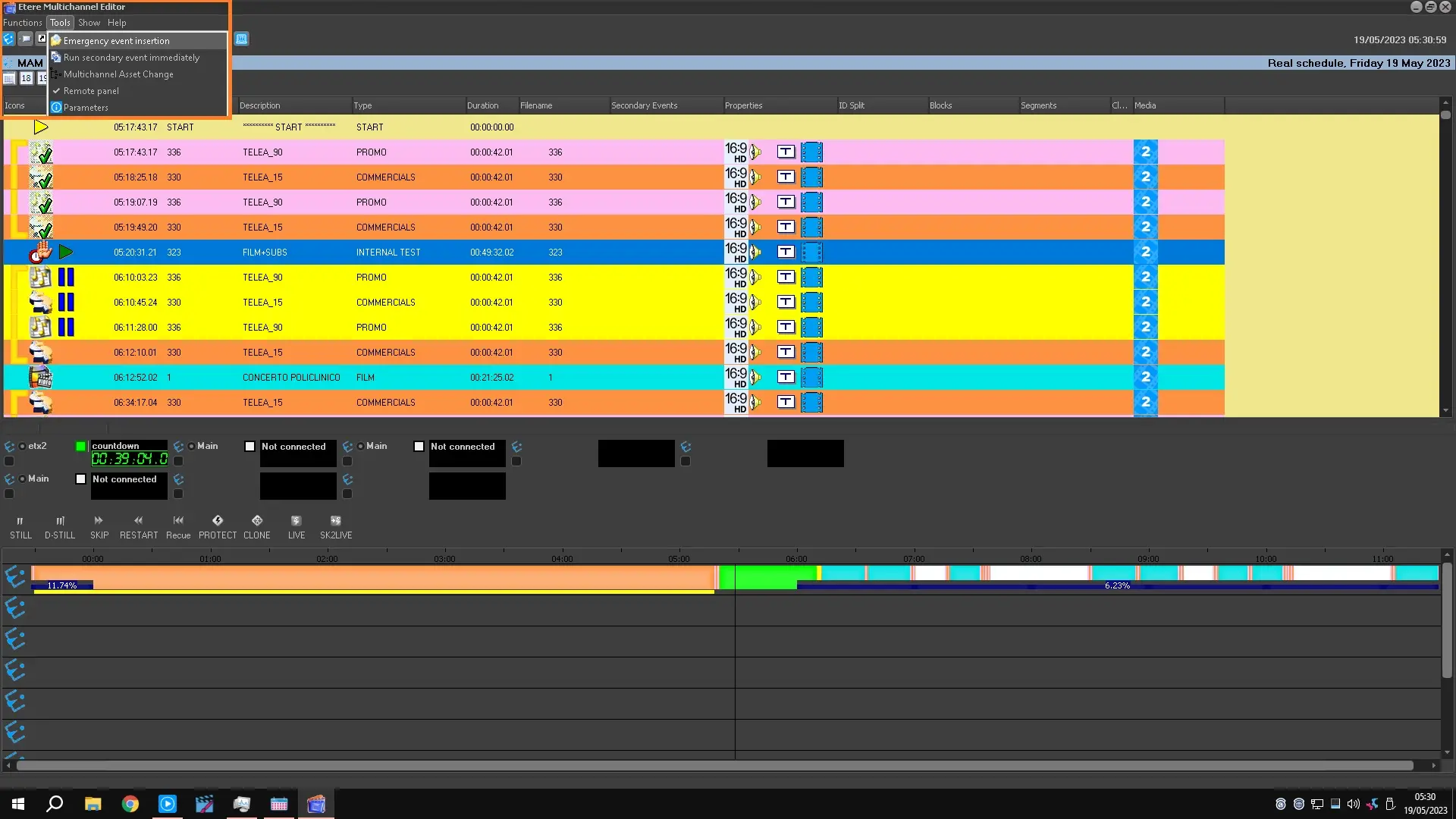 4. The asset will be inserted in all the selected automation schedules at the selected positions, making the schedules scroll down for the total duration of the asset (e.g., one hour):