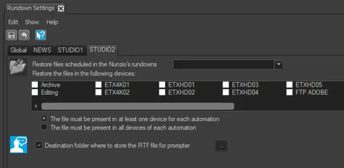 Restore files scheduled in the Nunzio’s rundowns: This parameter allows you to restore files scheduled in one of the Nunzio’s rundowns, e.g. HSM Archive, News story approval, Not to broadcast, etc.