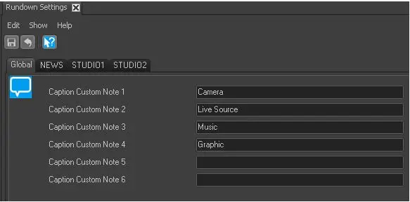 Global Settings In the Settings node, you can add up to 6 additional Notes columns and define different description for each column in the rundown. Rundown_settings_1