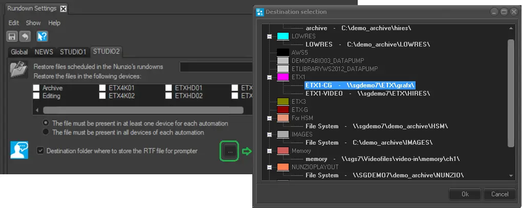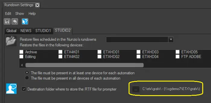 Destination folder where to store the RTF file for prompter: If the MOS Control function is activated, you can enable this option to export the rundown into RTF (Rich Text Format) and click the browse button to select a destination folder to store the RTF file.