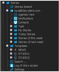 The Stories section contains all stories assigned to the journalist, all tasks, notifications, available templates, story basket, the search function and certain story settings.
