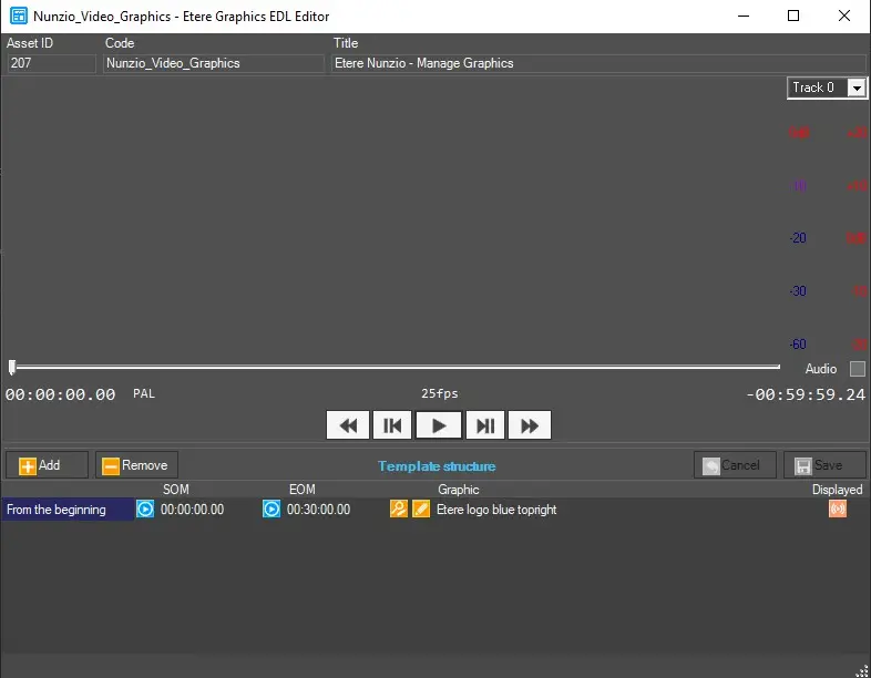 Default Graphics for video in the story: this button allow to configure the graphics to assign to all videos in the stories. Clicking this button the following form will open, where the user can select the ETX-G graphic from the database and specify in which timecode range it will be visible onair. Refer to Stories management chapter for more information about how to use the Etere Graphics EDL Editor.
