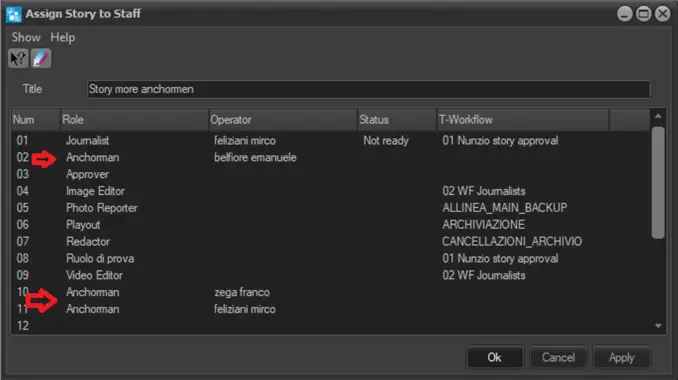 When creating stories, you can assign the story to different anchorman in the Anchorman user group defined in the ROLES category.