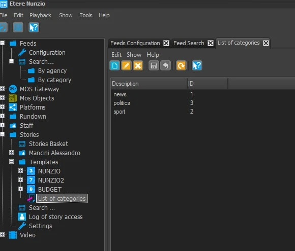 Save: Apply the modifications to the categories list. The new category will have ID=-1 as soon as it's created, but it will change to a progressive number when the Save button is pressed.
