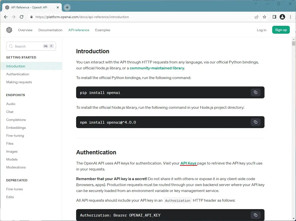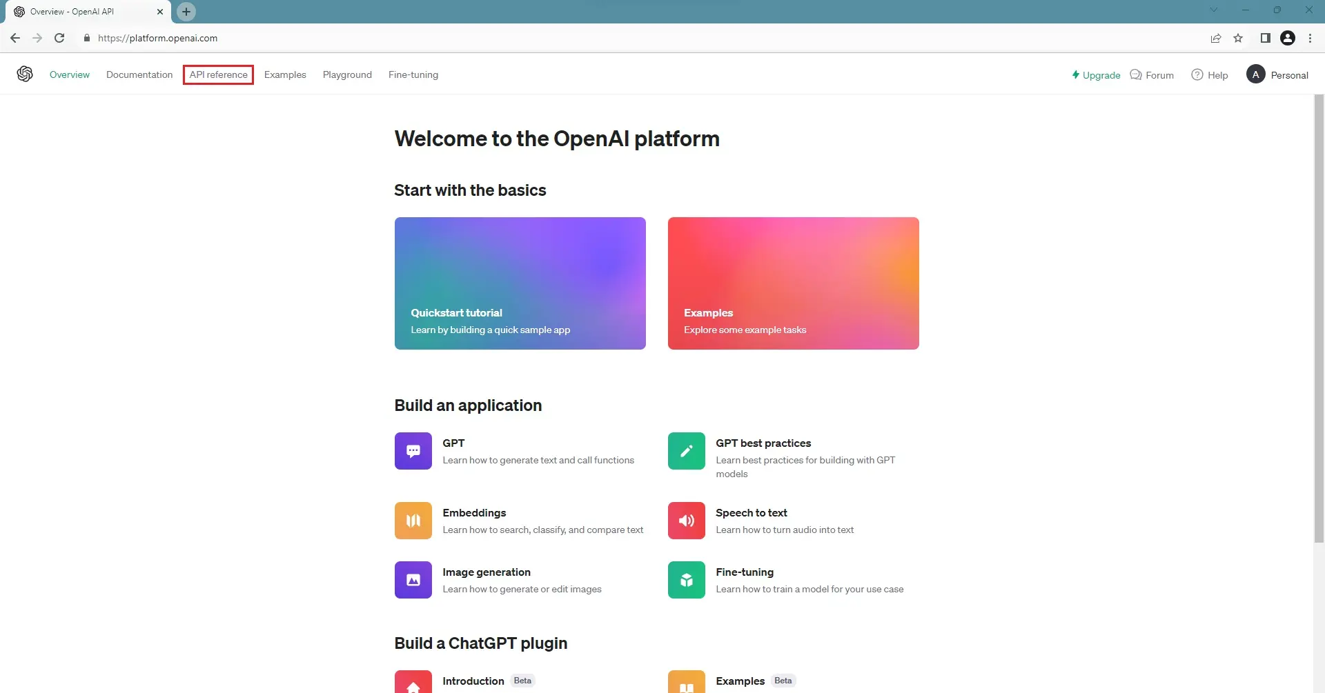 7. Go back to the page https://platform.openai.com/ and click on the API reference menu