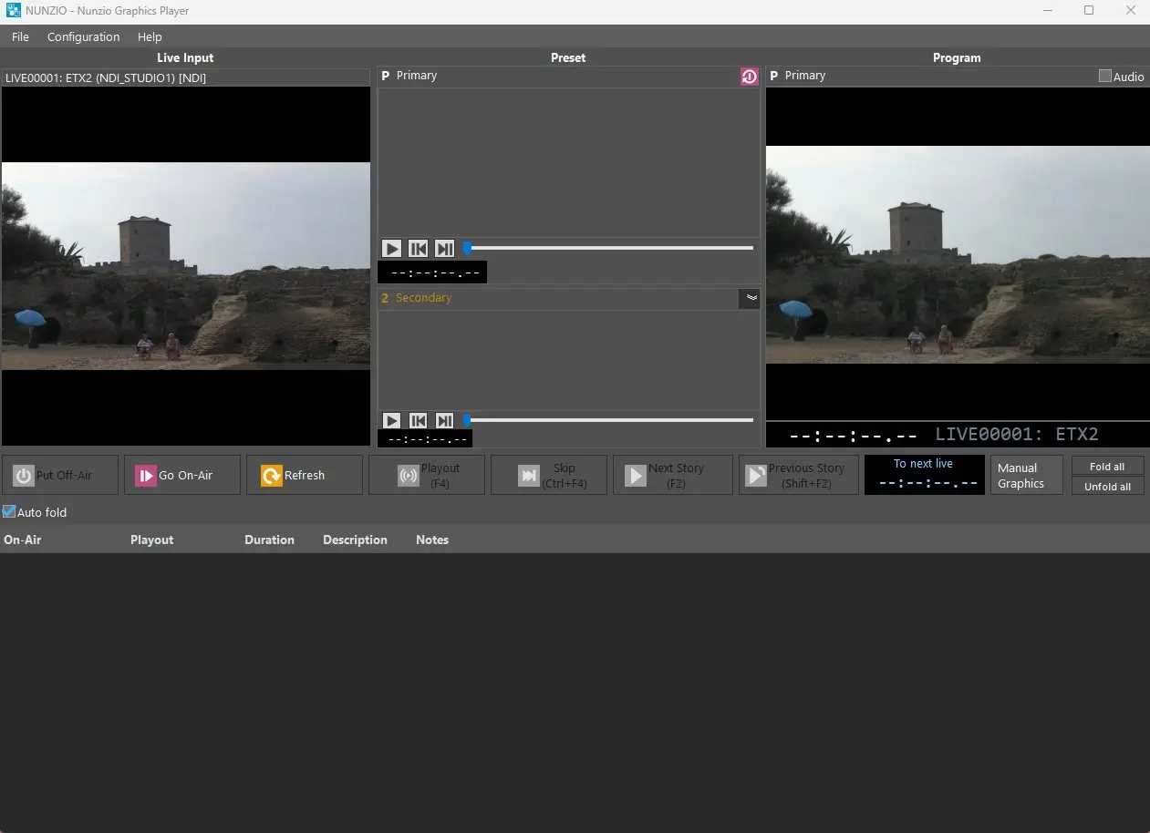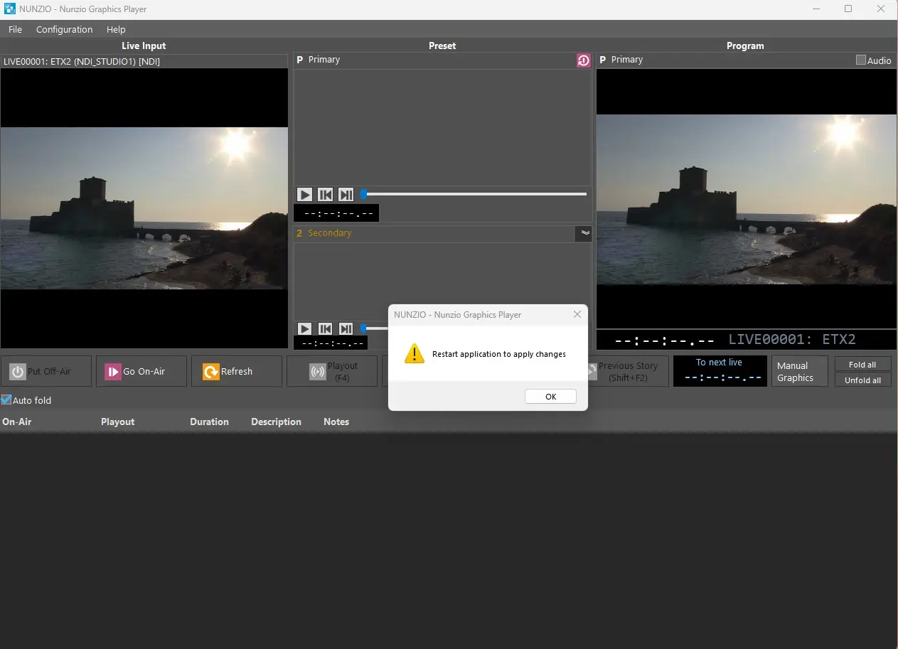 In this section it's possible to assign an output, either SDI or NDI, which will function as output Program for Nunzio ETX Playout. Ths would be our MAIN output signal.