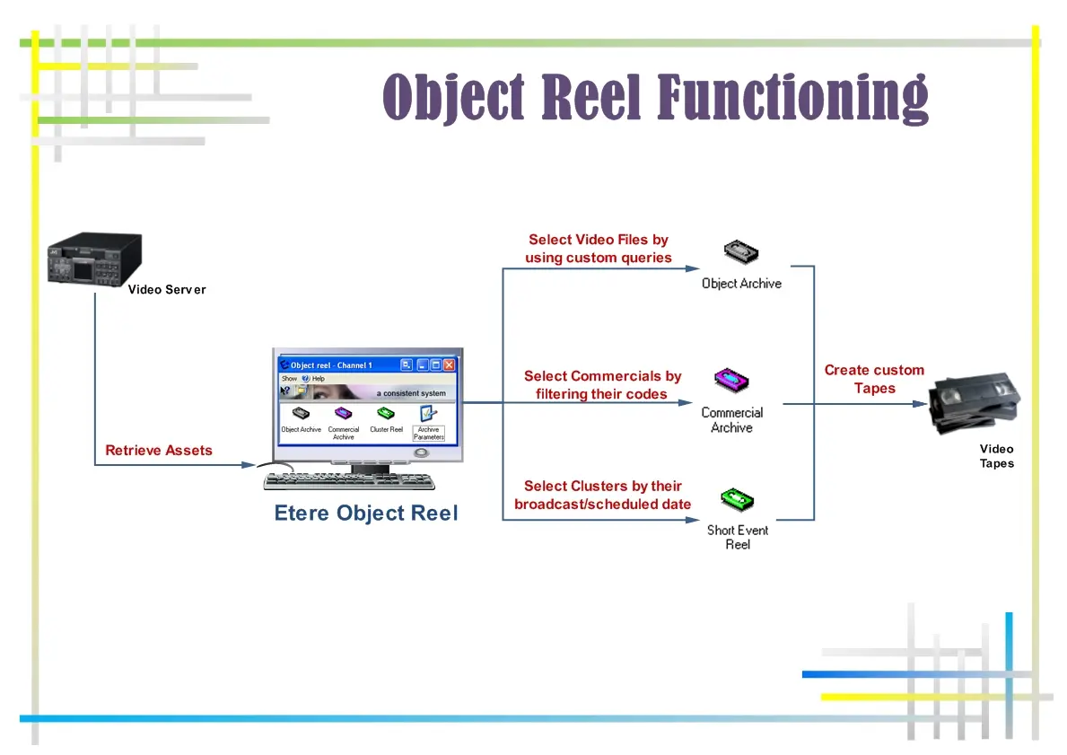 Etere's application Object Reel was developed to improve the search, selection and subsequent archive of either generic, commercial or clustered media by implementing custom filters and independent modules for each type of object you intend to store on videotapes, also allowing automatic insertion of 'colour bars' and 'black screens' between videos. Object Reel is currently composed of three modules, each of which performs the following tasks: