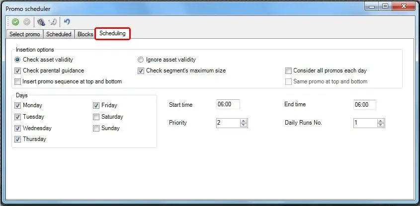 NB: Please note that in case the "insert promo sequence in top and bottom" parameter is enabled, it won't be possible to set the scheduling priority since it will be managed by the system (i.e. 3 for top and 997 for bottom promos).