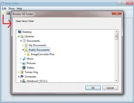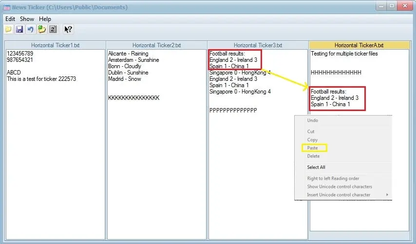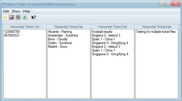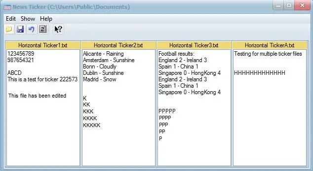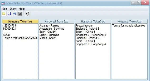 Select “Public Documents” folder where all the 4 ticker files are stored and click <OK> to confirm the folder selection. All files are opened in the News Ticker window for editing.