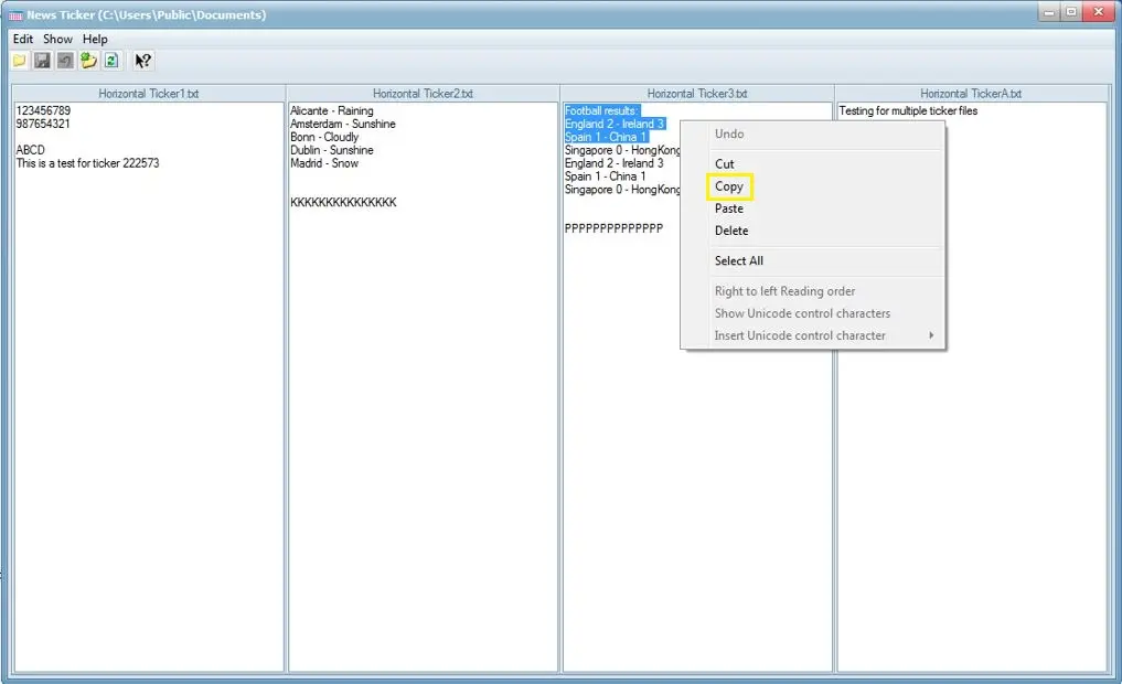 From the News Ticker edit box, simply select the content you want to make duplication, right-click and select "Copy".