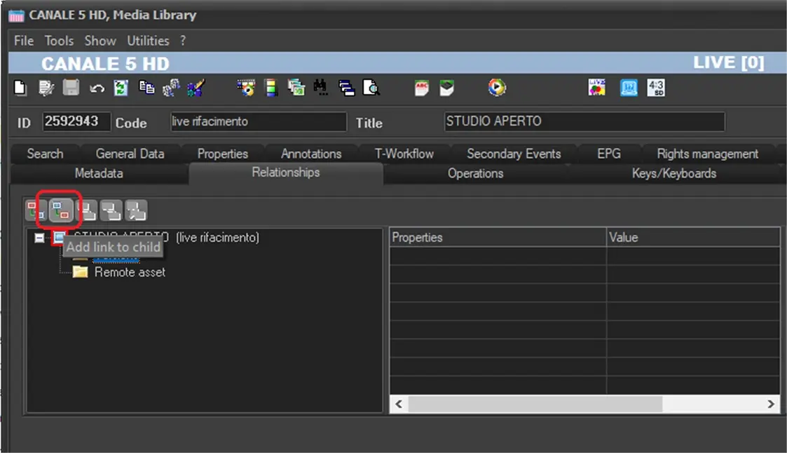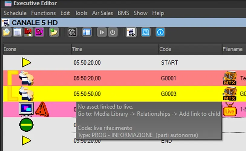 From Etere version 33.2.182.6699, it's possible to schedule LIVE assets with a linked child asset and display a warning in case the link to the child does not exist.