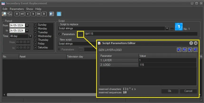 Under the "Script to replace" section, you can search through the script strings or logo generators to locate and replace the secondary events.