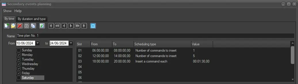 Time slots - Enter the -up to ten- time intervals featuring the commands (i.e. secondary events) to be planned. Available scheduling types includes: