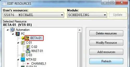 •Click on the [Users] button and [Add] the "user" (e.g. michael) and "function" (i.e. scheduling) required for using the resource; additionally, set "com port" on which the VTR is available as well as the "router input" to which the VTR is connected.