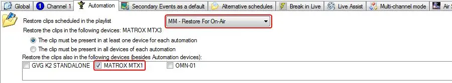 - In the "Restore the clips also in the following devices" panel, select the MTX device used by the Video Assist server for the playout in order to indicate that scheduled asset's media must be restored in case they are not present in the selected devices (besides that in the main and clone devices).