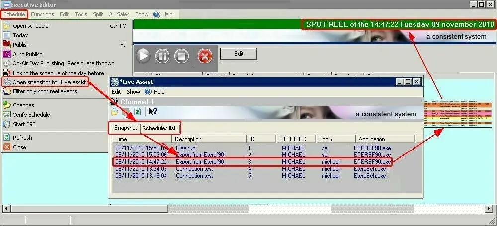 Please note that each time a new snapshot is created from Etere F90 (either manually or automatically), the clock alarm warn will be displayed in the top part of all Executive Editor instances of the Video Assist server to indicate operators that there's a new Video Assist schedule available.