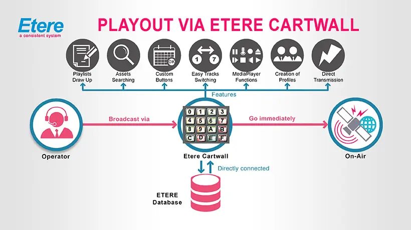 The figure below clearly illustrates how Etere Cartwall simplifies the broadcasting process to an operator using various features: