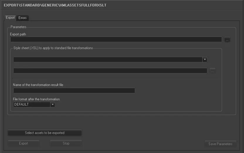Stylesheet (.XSL) to apply to standard file transformations - If specified, exported XML data will be converted from the standard format into a custom format, based on the given XSL style sheet (e.g. ET_XML_ASSETS_FULL_XSLT).