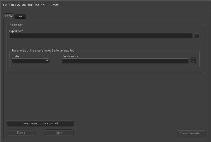•Parameters of asset's linked file to be exported: Select the codec (e.g. MXF) and cloud-device (e.g. \\mserver\video\hires\) related to the files to be exported.
