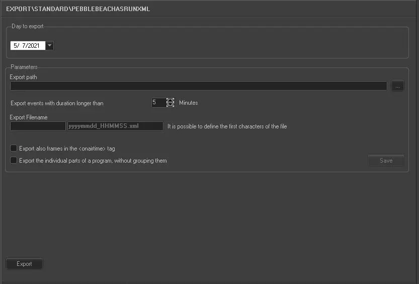 The PEBBLE BEACH ASRUN XML export allows exporting an XML file containing the broadcast schedule of one selected day formatted conforming to the specifications of Pebble Beach systems.