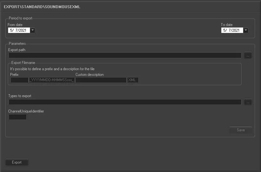 The Export_Standard_Soundmouse XML export scheduling, transmission data and production data within the indicated date range to an XML file.